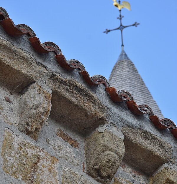 Située au centre du bourg, l'église dédiée à Saint Denis est classée Monument Historique par arrêté du 9 septembre 1943. Elle est l'oeuvre de deux campagnes de construction romane (XIème et XIIème siècles). En voici la description précise : « Abside et absidioles en hémicycle, restaurées en 1867, que précèdent de longues travées droites voûtées en berceau et communiquant entre elles par des ouvertures en plein cintre. Nef et bas-côtés repris dans la seconde moitié du XIIème siècle. Des berceaux brisés les couvrent et de grandes arcades, de même tracé, sont lancées entre des piles rectangulaires cantonnées de colonnes. Les chapiteaux décorant les piliers de la nef sont ornés de feuillages et d'oiseaux buvant dans des coupes. A l'extérieur, le pignon de façade, restauré en 1878, n'a conservé de sa décoration primitive que la croix pommetée du sommet. Le clocher carré, élevé sur la croisée, présente un étage percé sur chaque face de deux baies en plein cintre, serties de boudins. La flèche de pierre qui devait le couronner a été remplacée par une toiture. » En 2009, soucieuse d'entretenir son précieux patrimoine, la municipalité de Deux-Chaises a commandé la restauration de cette toiture en essentes de châtaignier ainsi que le remplacement du coq surplombant le clocher. |